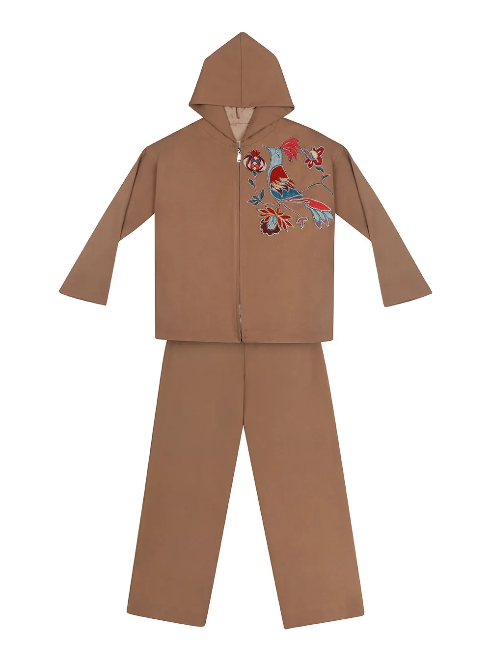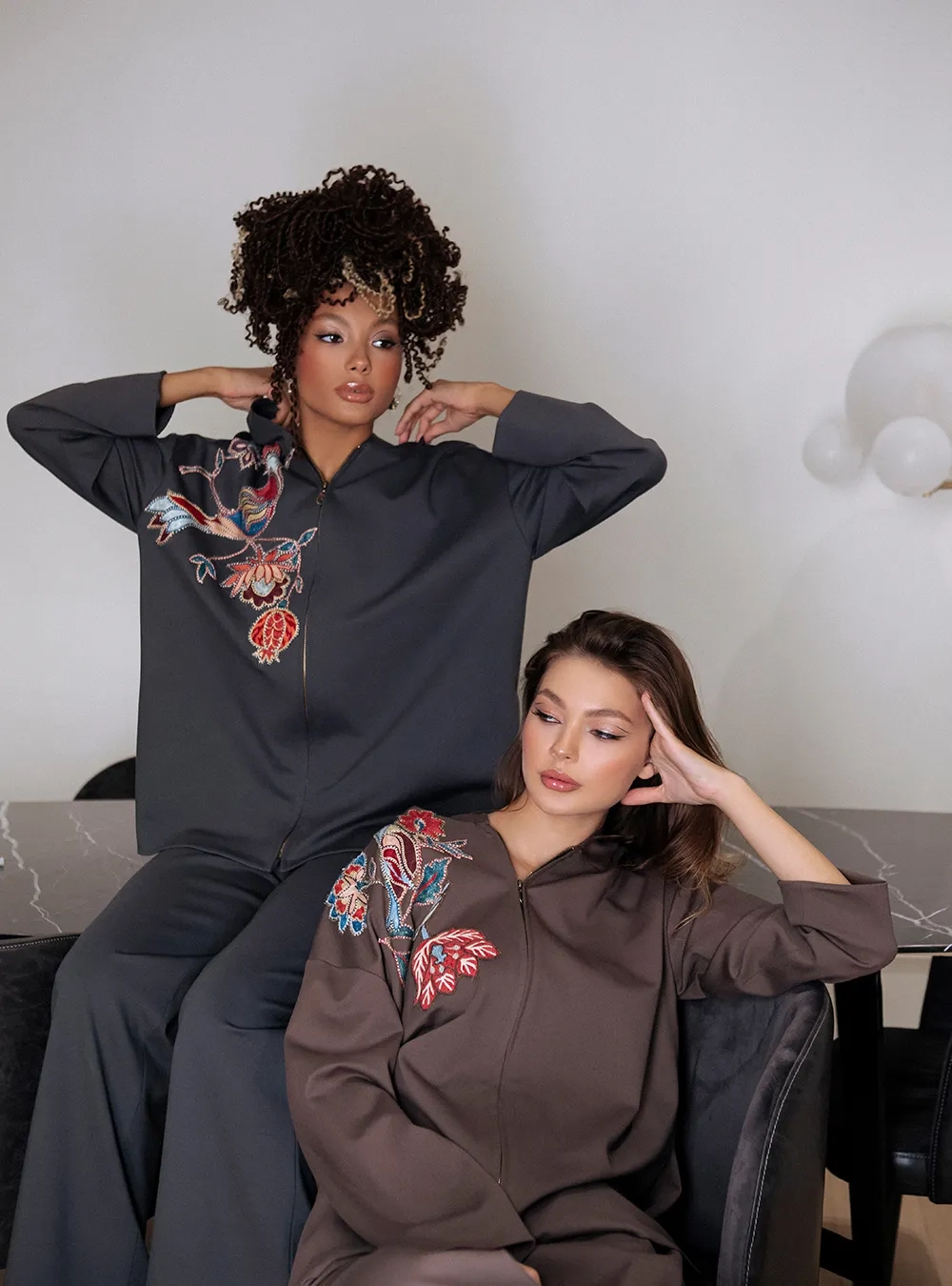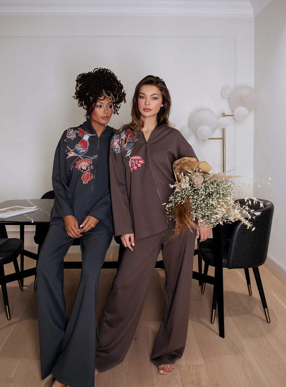 A tracksuit that is decorated with suzani (handmade embroidery). Stylish solution for your comfortable pastime. You can also purchase hoodies separately or leave a request for suits in a different color.