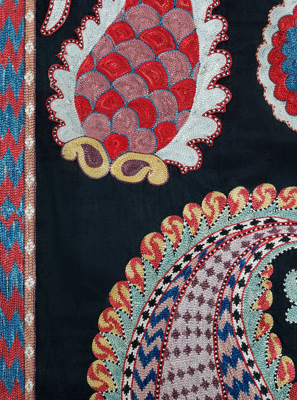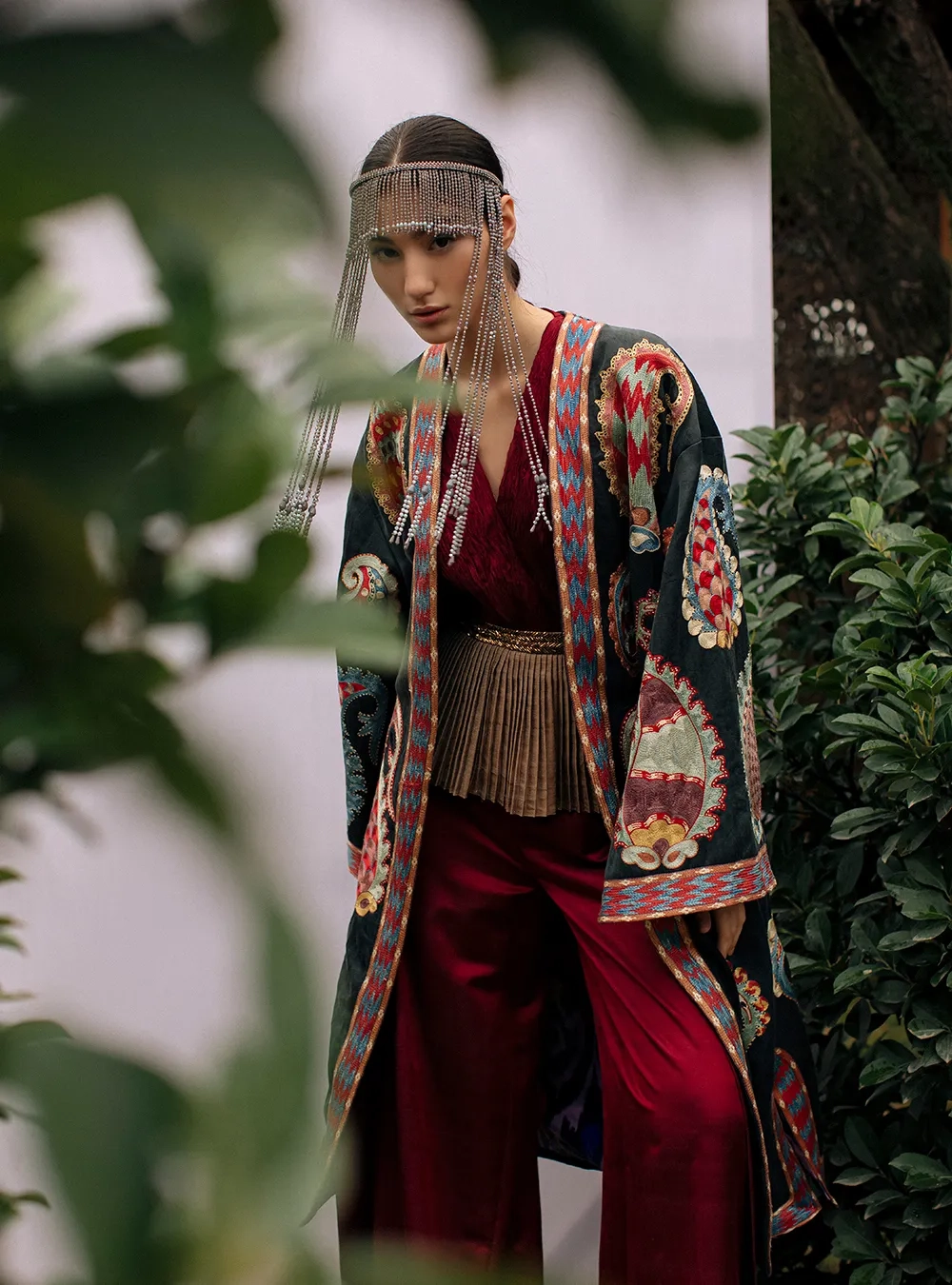 Chapan (Uzbek national outerwear) is made in a traditional technique with the addition of the designer’s original vision. Each item is embroidered by hand by Bukhara hereditary craftsmen for about two months. The sleeves are zippered for a variety of styles.