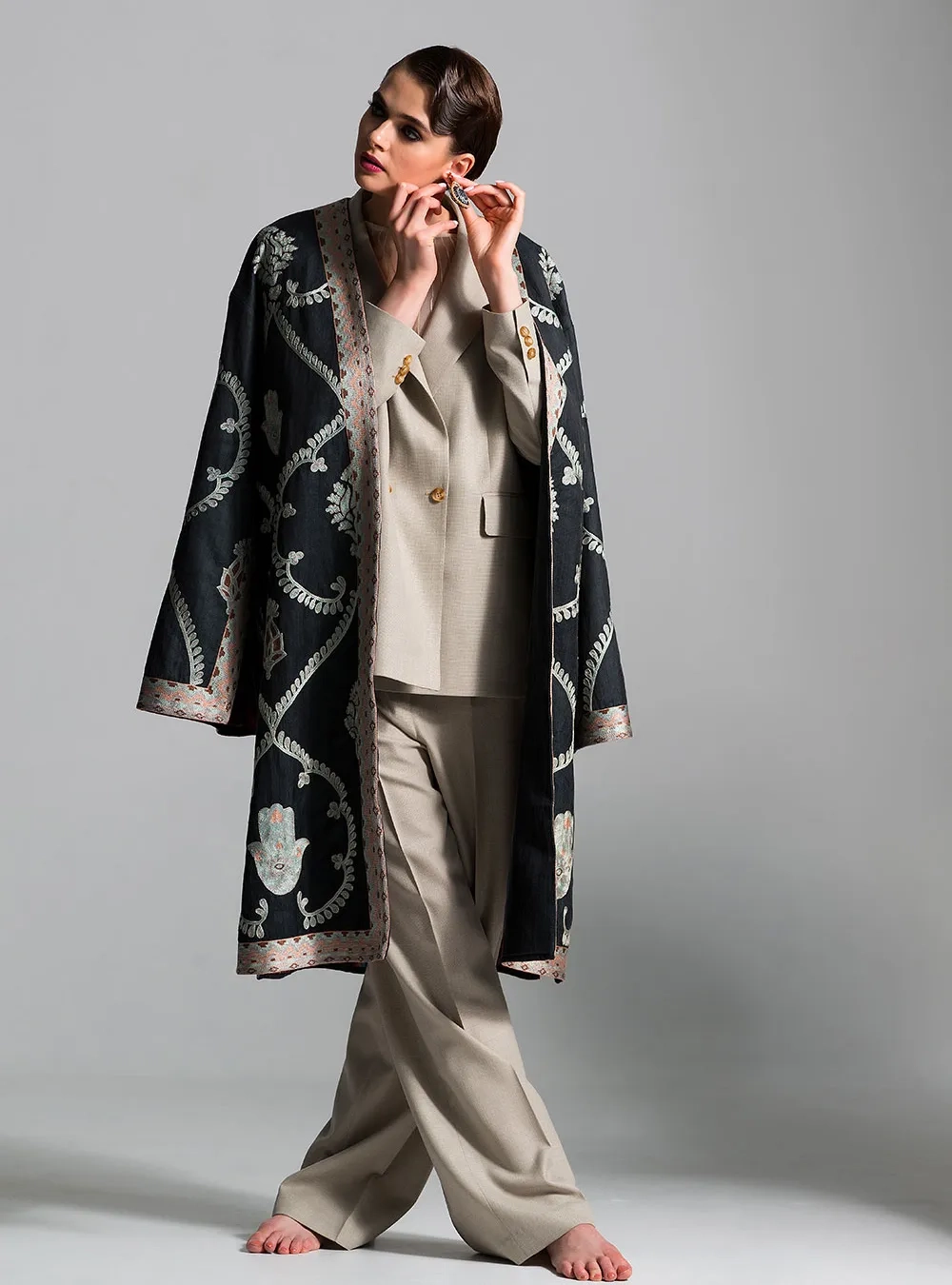 Chapan (Uzbek national outerwear) is made in a traditional technique with the addition of the designer’s original vision. Each item is embroidered by hand by Bukhara hereditary craftsmen for about two months. The sleeves are zippered for a variety of styles.