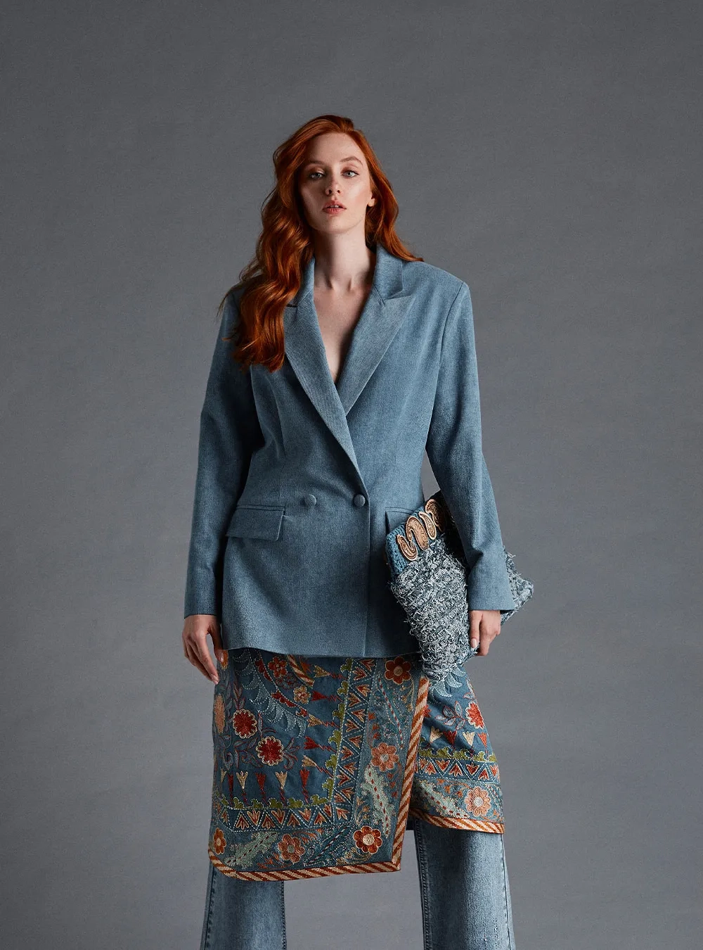 A piece from the B Jeans x Dildora Kasimova collaboration. A new look at denim and classic shapes with the addition of the designer’s original vision.