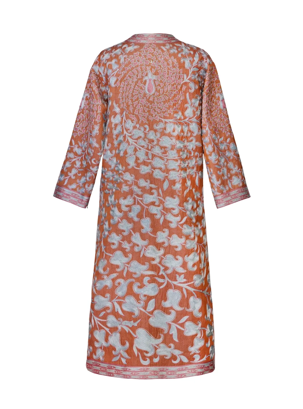 Чапан (узбекская национальная верхняя одежда) выполнен в традиционной технике с добавлением авторского видения дизайнера. Каждое изделие вышивается вручную бухарскими потомственными мастерами около двух месяцев. На рукавах предусмотрены молнии, чтобы стилизовать на разный лад.