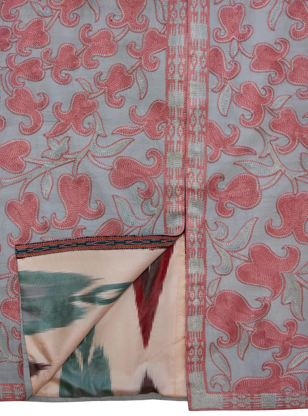 Чапан (узбекская национальная верхняя одежда) выполнен в традиционной технике с добавлением авторского видения дизайнера. Каждое изделие вышивается вручную бухарскими потомственными мастерами около двух месяцев. На рукавах предусмотрены молнии, чтобы стилизовать на разный лад.
