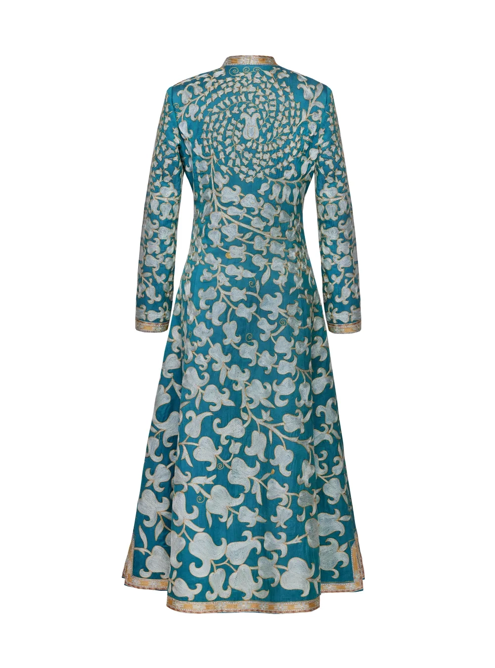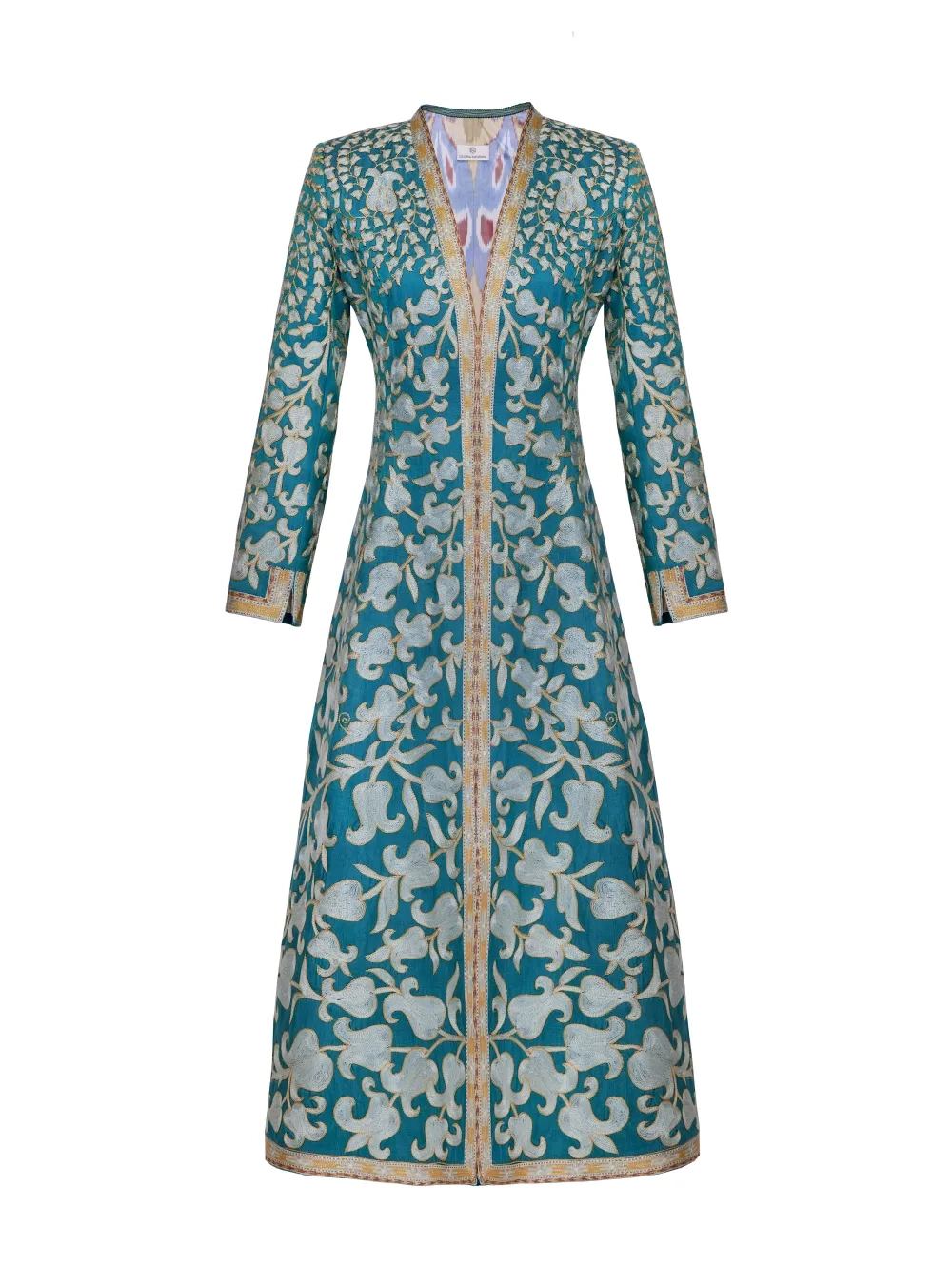 Чапан (узбекская национальная верхняя одежда) выполнен в традиционной технике с добавлением авторского видения дизайнера. Каждое изделие вышивается вручную бухарскими потомственными мастерами около двух месяцев. На рукавах предусмотрены молнии, чтобы стилизовать на разный лад.