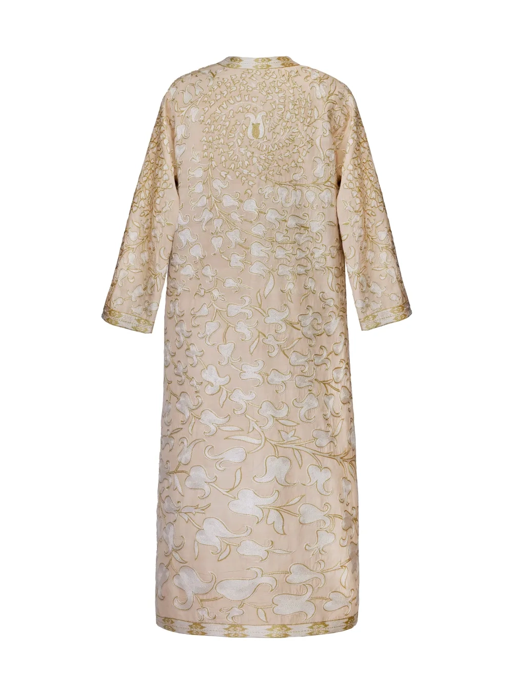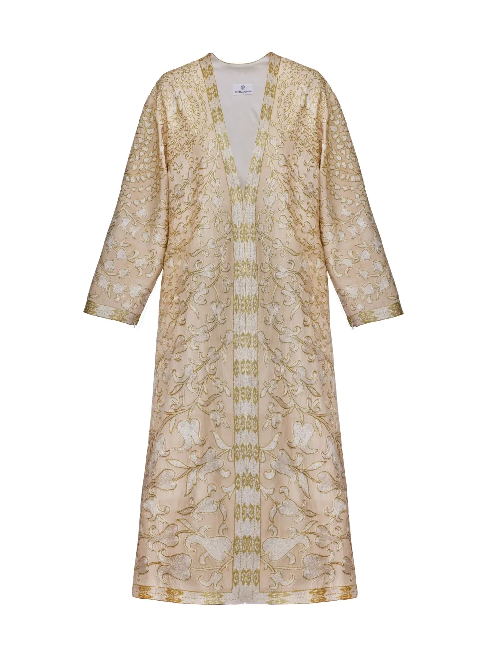 Чапан (узбекская национальная верхняя одежда) выполнен в традиционной технике с добавлением авторского видения дизайнера. Каждое изделие вышивается вручную бухарскими потомственными мастерами около двух месяцев. На рукавах предусмотрены молнии, чтобы стилизовать на разный лад.