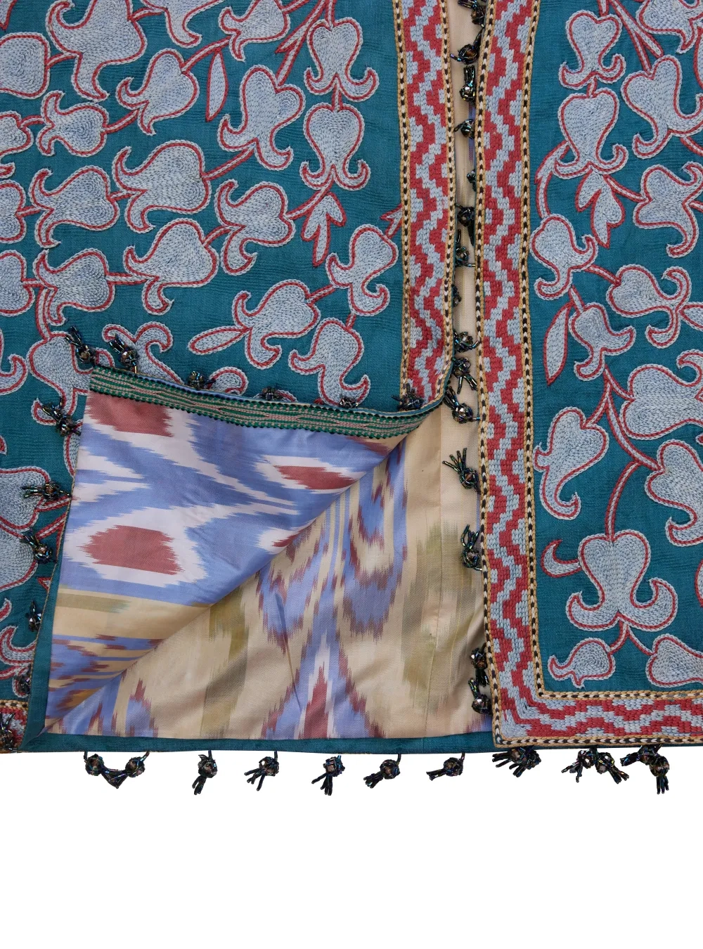 Чапан (узбекская национальная верхняя одежда) выполнен в традиционной технике с добавлением авторского видения дизайнера. Каждое изделие вышивается вручную бухарскими потомственными мастерами около двух месяцев. На рукавах предусмотрены молнии, чтобы стилизовать на разный лад.