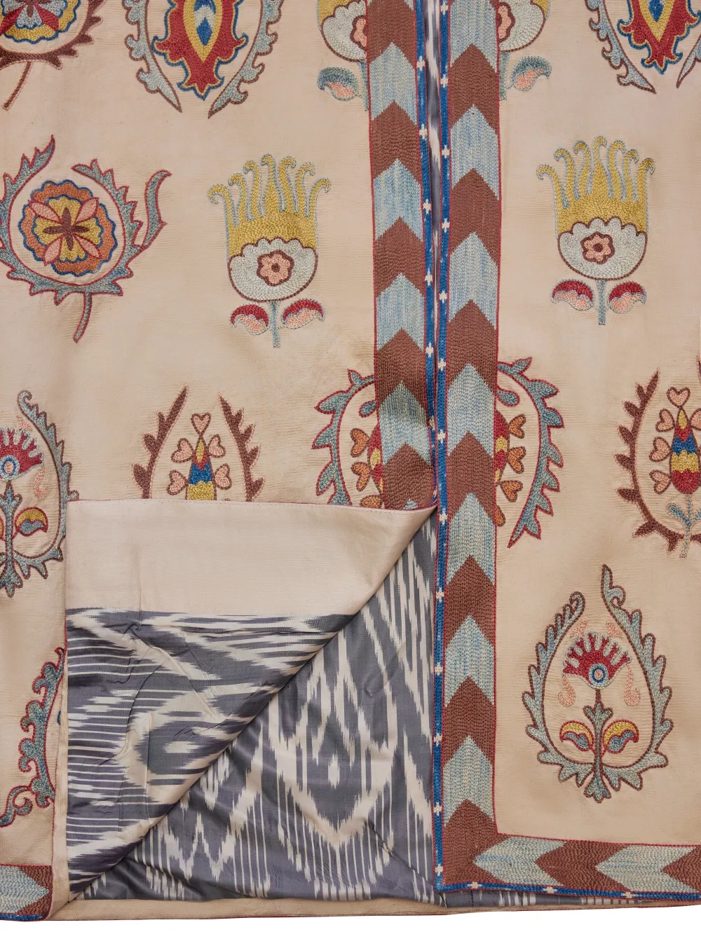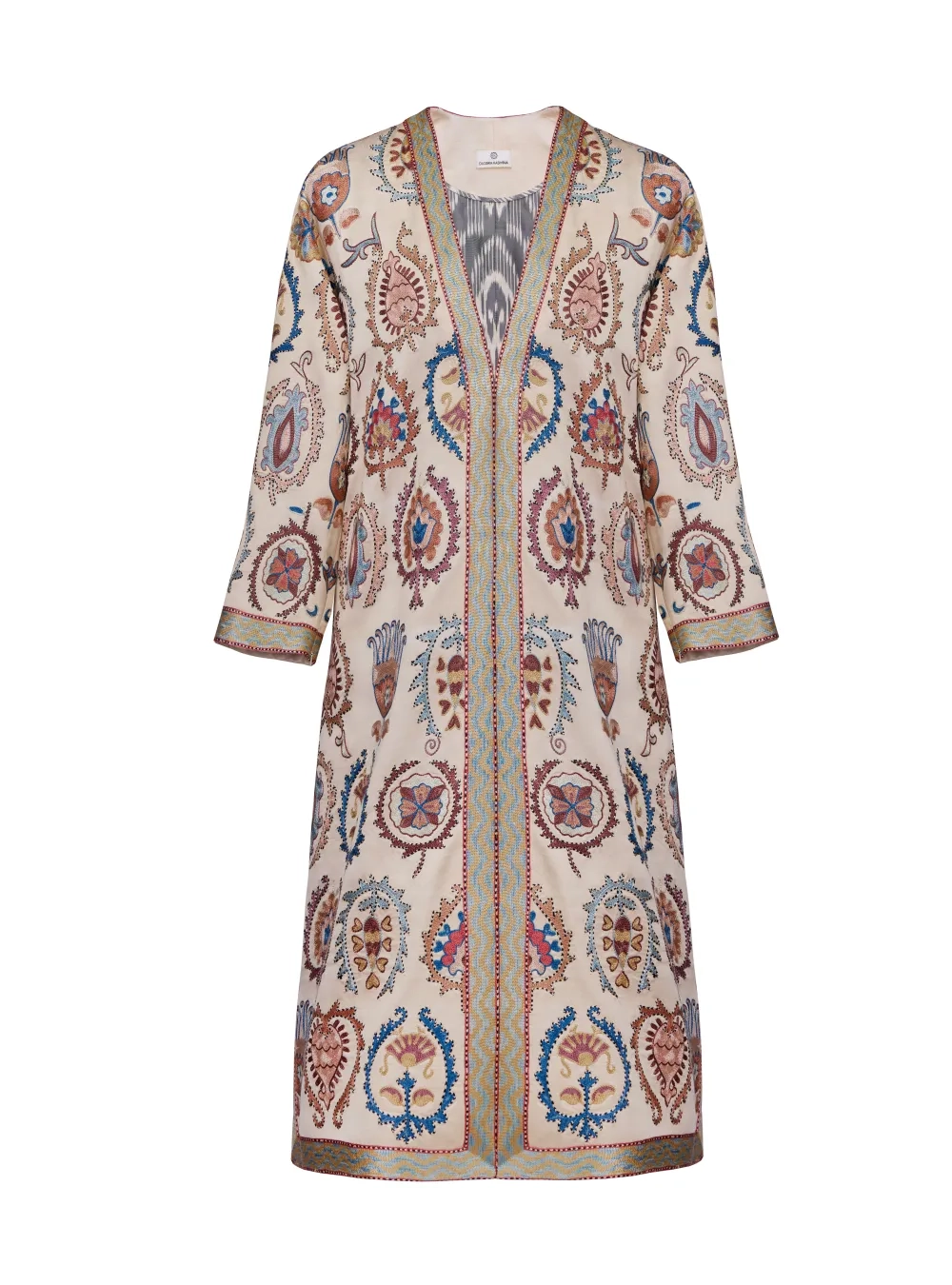 Чапан (узбекская национальная верхняя одежда) выполнен в традиционной технике с добавлением авторского видения дизайнера. Каждое изделие вышивается вручную бухарскими потомственными мастерами около двух месяцев. На рукавах предусмотрены молнии, чтобы стилизовать на разный лад.