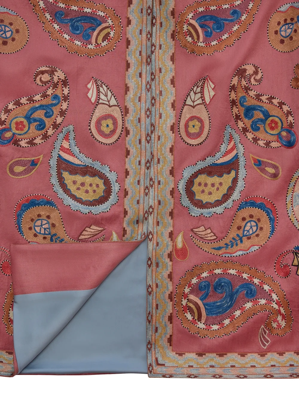 Чапан (узбекская национальная верхняя одежда) выполнен в традиционной технике с добавлением авторского видения дизайнера. Каждое изделие вышивается вручную бухарскими потомственными мастерами около двух месяцев. На рукавах предусмотрены молнии, чтобы стилизовать на разный лад.