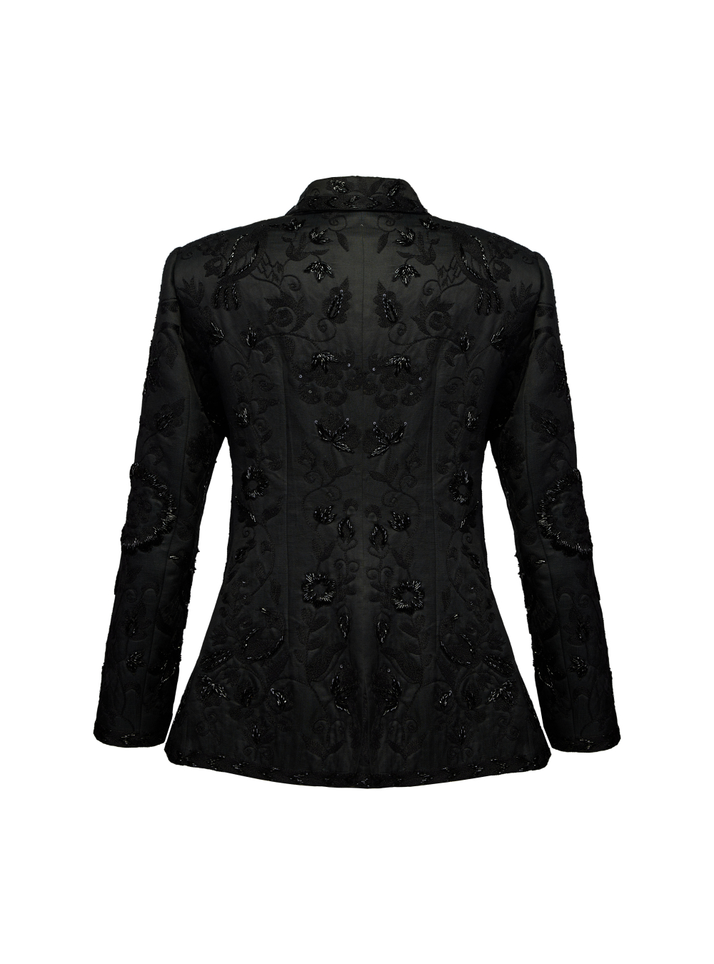 Роскошный пиджак из шелка, декорированный вышивкой ручной работы cюзане, а также украшен бисером. Изделие изготавливается потомственными мастерами Узбекистана около одного месяца. Можно стилизовать с вечерними платьями или костюмами для выхода в свет.