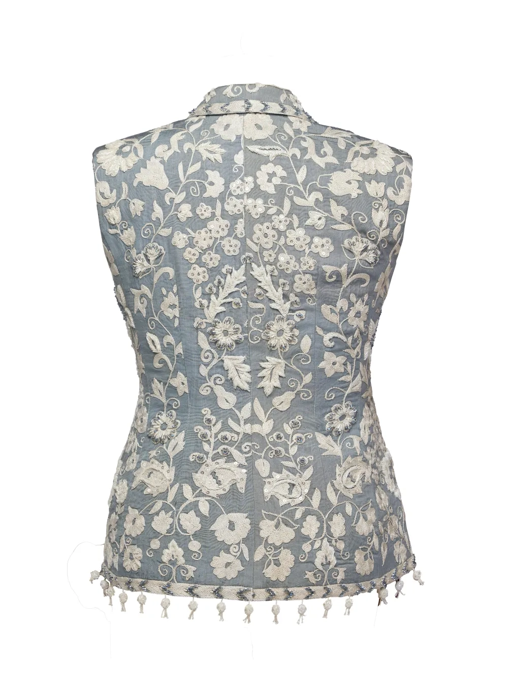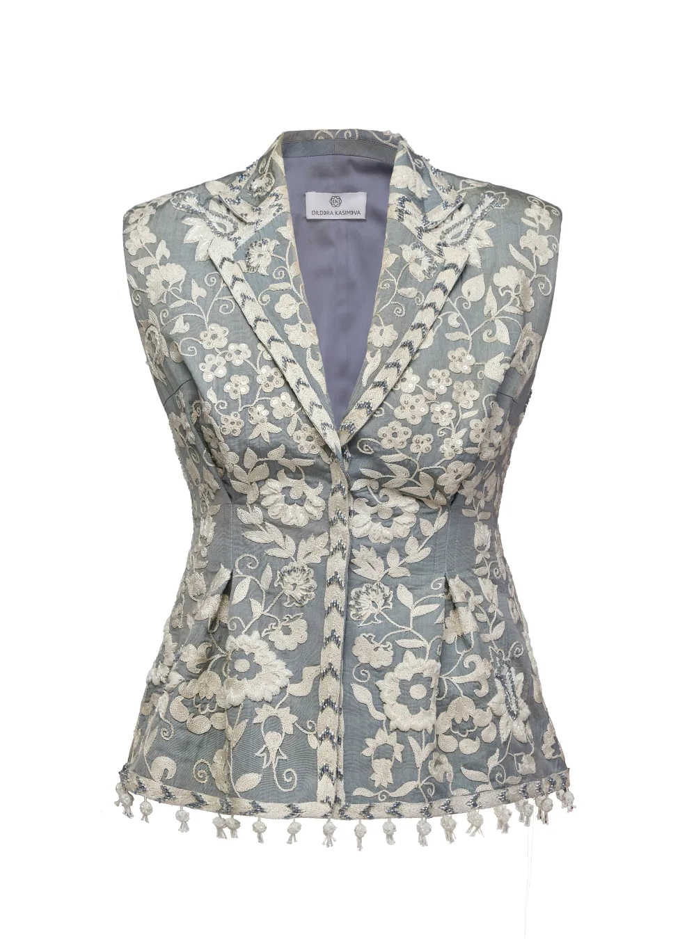 Роскошный жилет из шелка, декорированный вышивкой ручной работы cюзане, а также украшен бисером. Изделие изготавливается потомственными мастерами Узбекистана около одного месяца. Можно стилизовать с вечерними платьями или костюмами для выхода в свет.