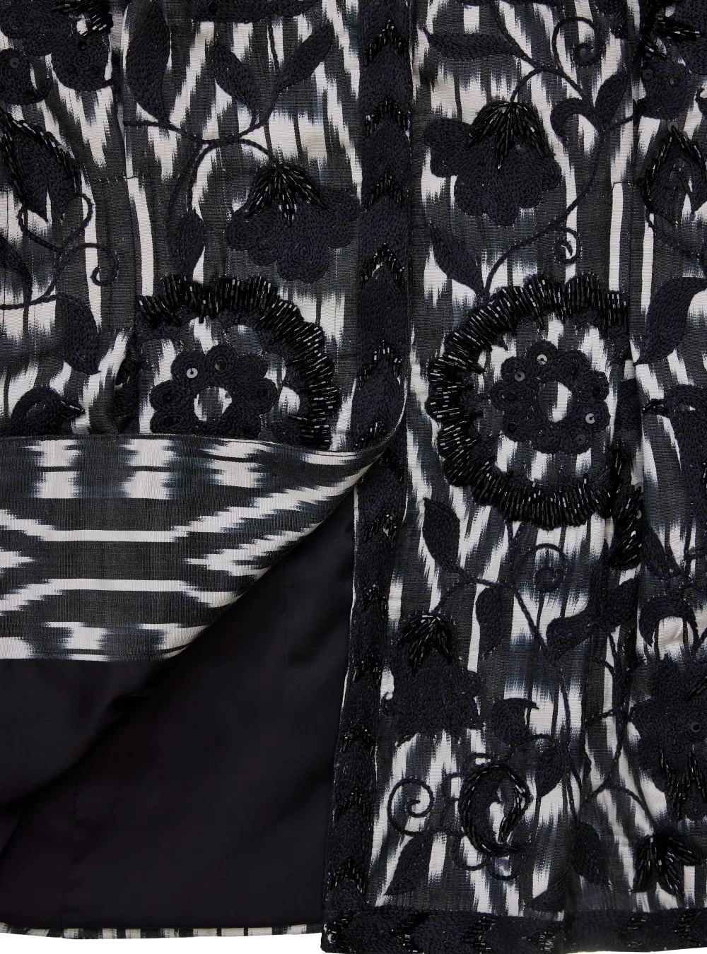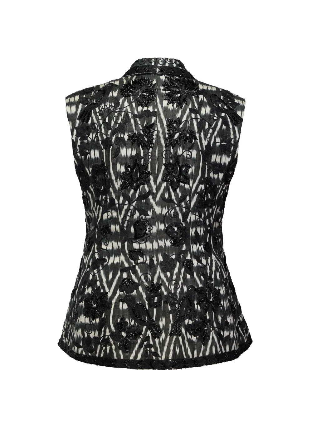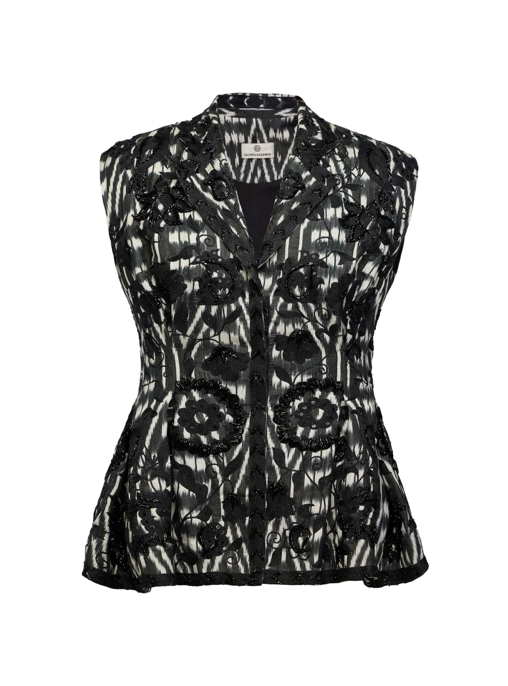 Роскошный жилет из шелка, декорированный вышивкой ручной работы cюзане, а также украшен бисером. Изделие изготавливается потомственными мастерами Узбекистана около одного месяца. Можно стилизовать с вечерними платьями или костюмами для выхода в свет.