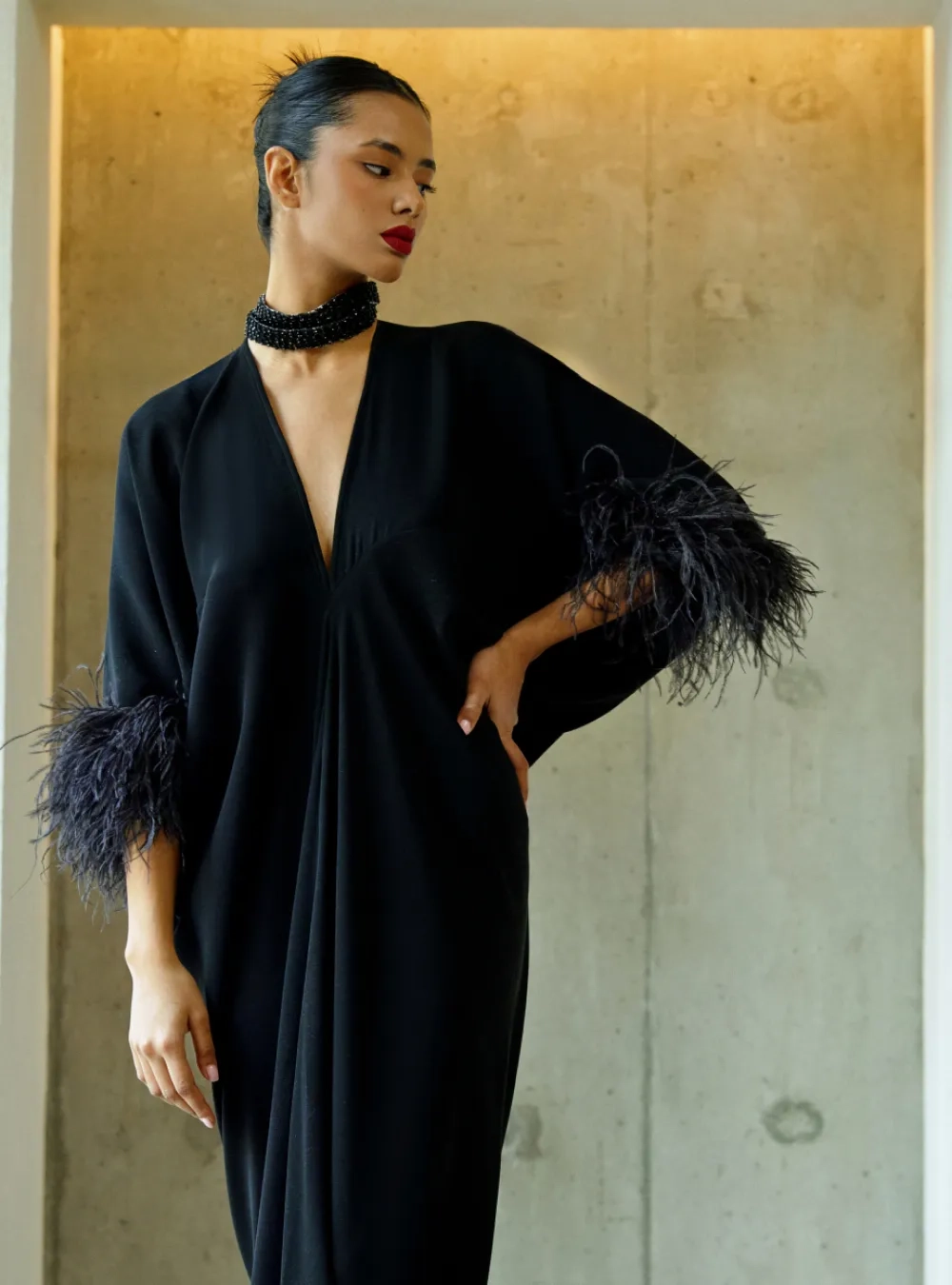 Чёрное платье от Dildora Kasimova – символ изысканности и минимализма. Лаконичный фасон дополнен воздушными рукавами с декором из перьев, добавляющим образу динамики и шика. Глубокий вырез и тонкая линия плеч акцентируют элегантность и утончённость. Идеальный выбор для вечерних выходов или торжественных мероприятий