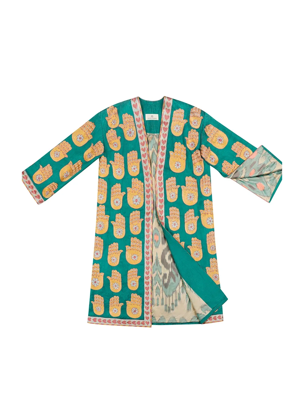 Чапан (узбекская национальная верхняя одежда) выполнен в традиционной технике с добавлением авторского видения дизайнера. Каждое изделие вышивается вручную бухарскими потомственными мастерами около двух месяцев. На рукавах предусмотрены молнии, чтобы стилизовать на разный лад.