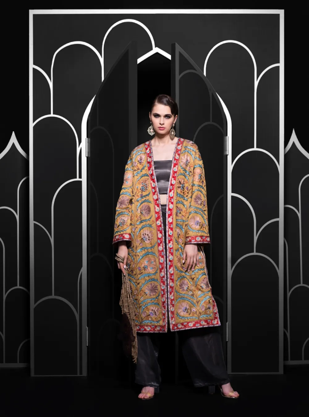Чапан (узбекская национальная верхняя одежда) выполнен в традиционной технике с добавлением авторского видения дизайнера. Каждое изделие вышивается вручную бухарскими потомственными мастерами около двух месяцев. Можно стилизовать с однотонными платьями или костюмами для вечерних выходов или с базовой одеждой на каждый день.