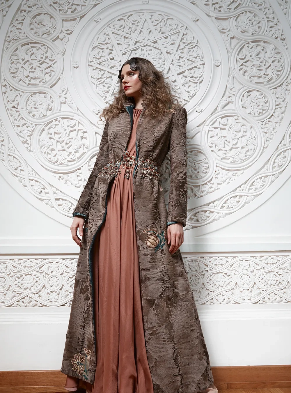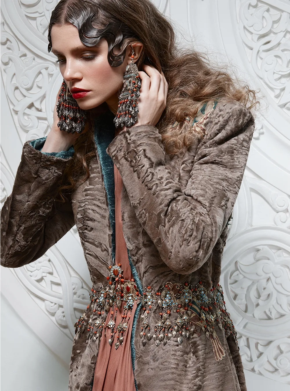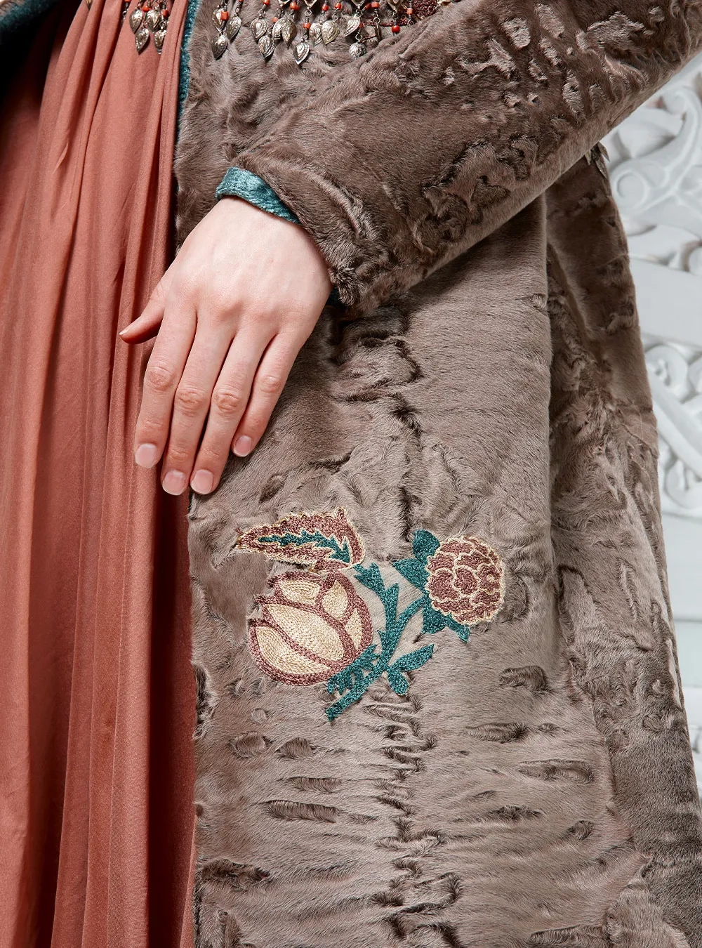 Роскошный чапан из меха каракульчи, декорированный вышивкой ручной работы cюзане. Красивое решение для холодной погоды.
