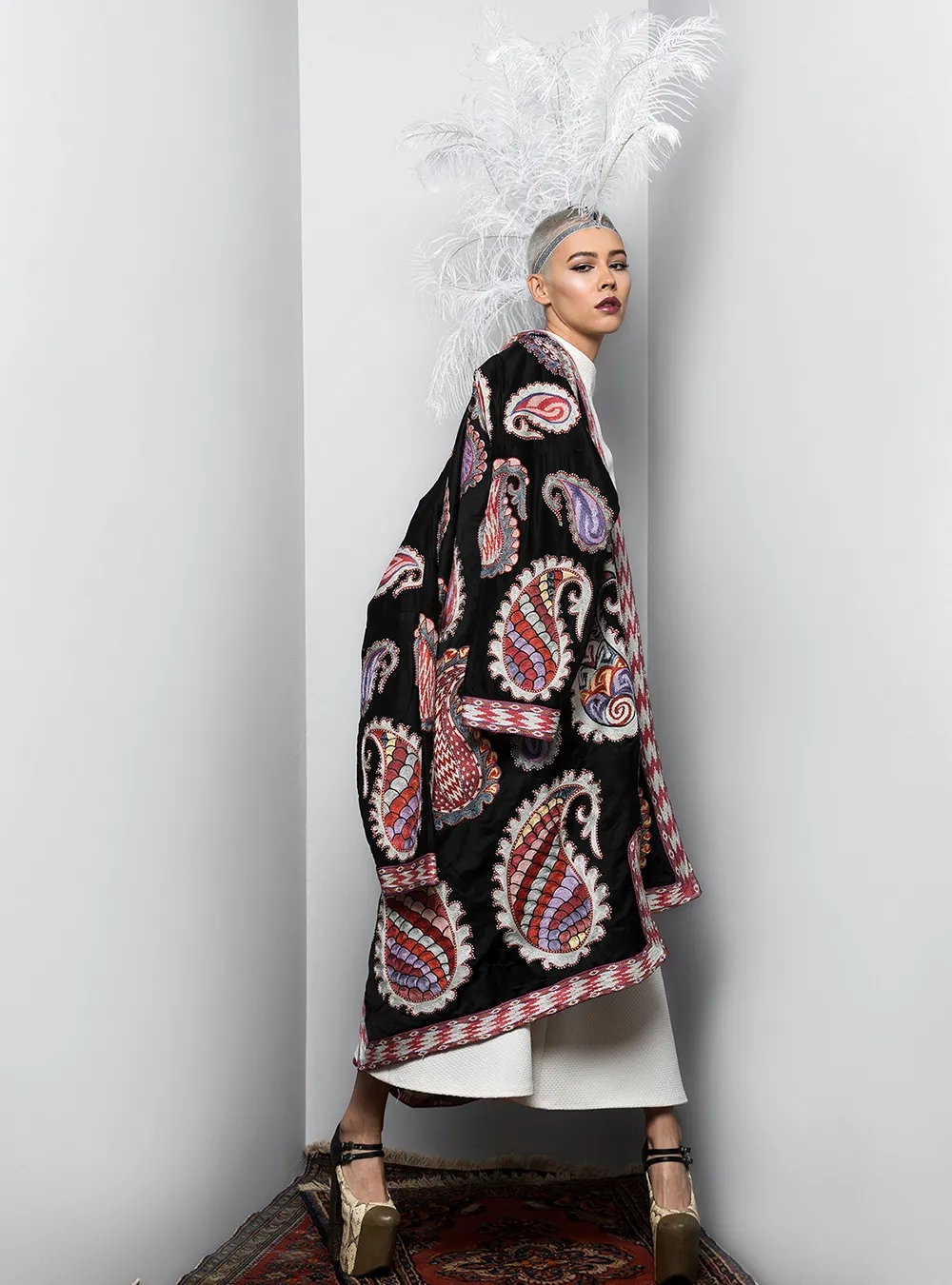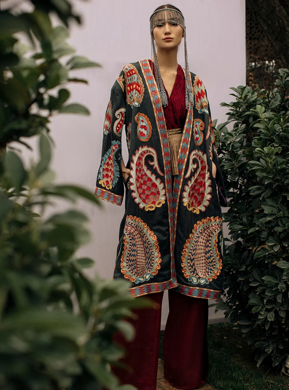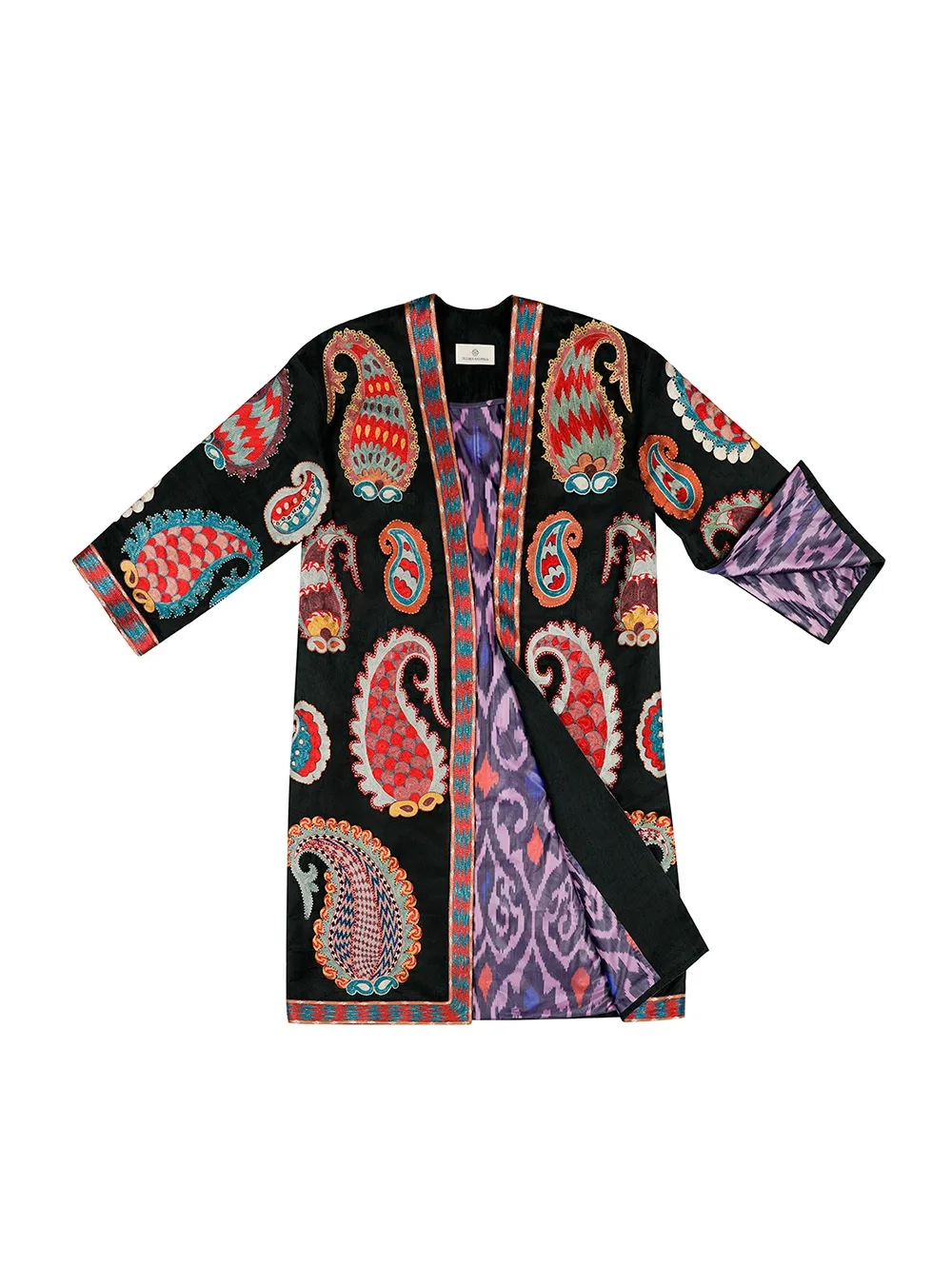 Чапан (узбекская национальная верхняя одежда) выполнен в традиционной технике с добавлением авторского видения дизайнера. Каждое изделие вышивается вручную бухарскими потомственными мастерами около двух месяцев. На рукавах предусмотрены молнии, чтобы стилизовать на разный лад.