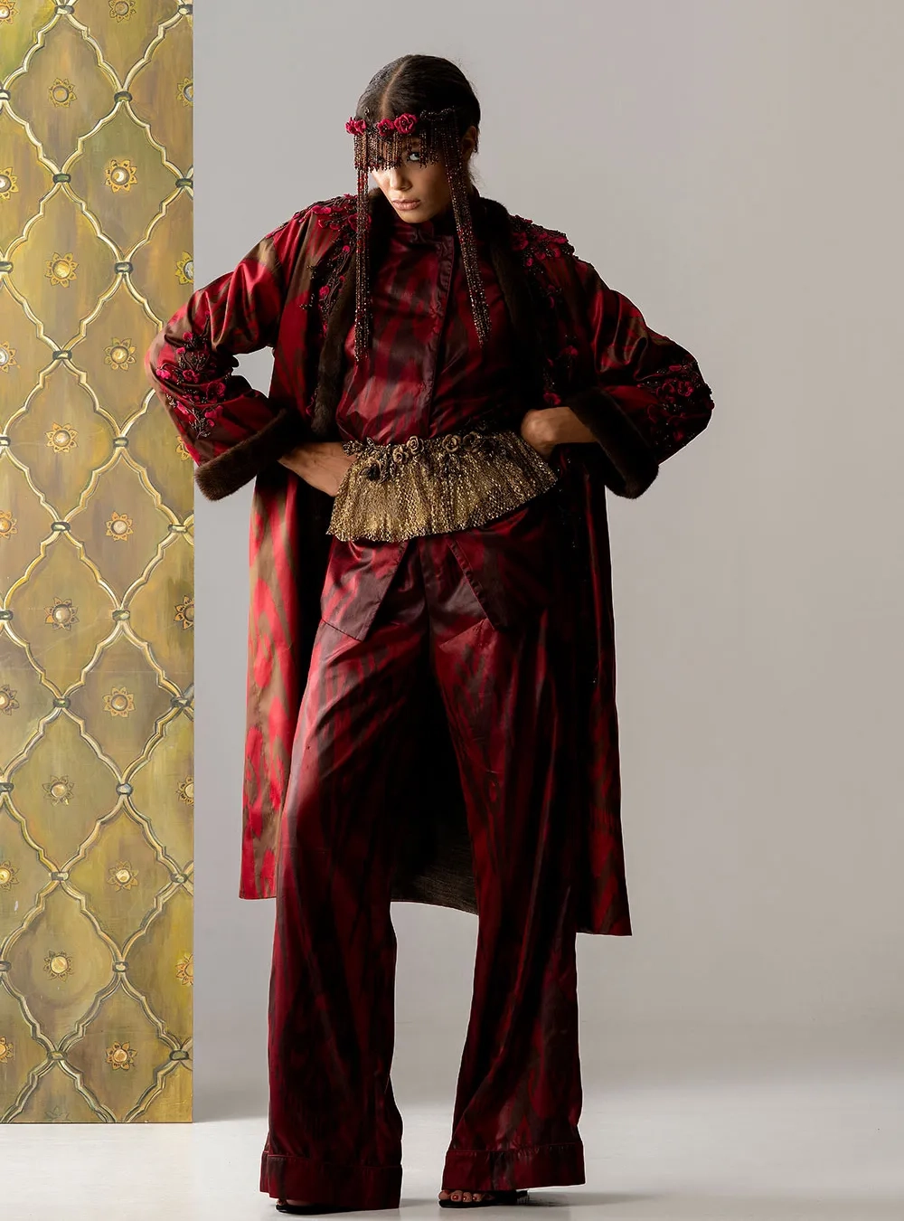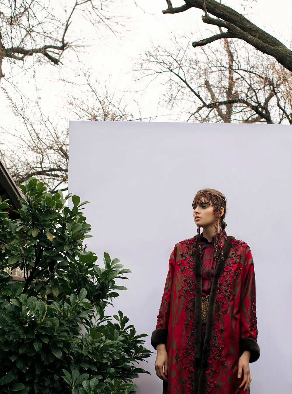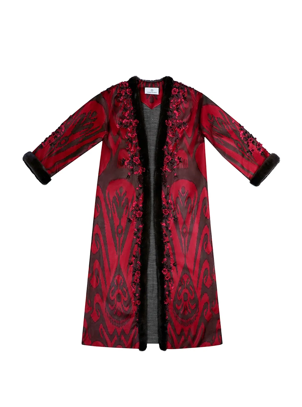 Чапан (узбекская национальная верхняя одежда) выполнен в традиционной технике с добавлением авторского видения дизайнера. Изделие выполнено из атласа, утеплено мехом норки и декорировано вышивкой бисером. Можно стилизовать с однотонными платьями или костюмами для вечерних выходов или с базовой одеждой на каждый день.