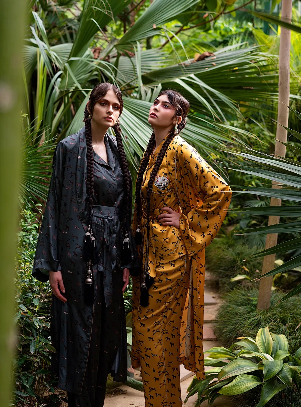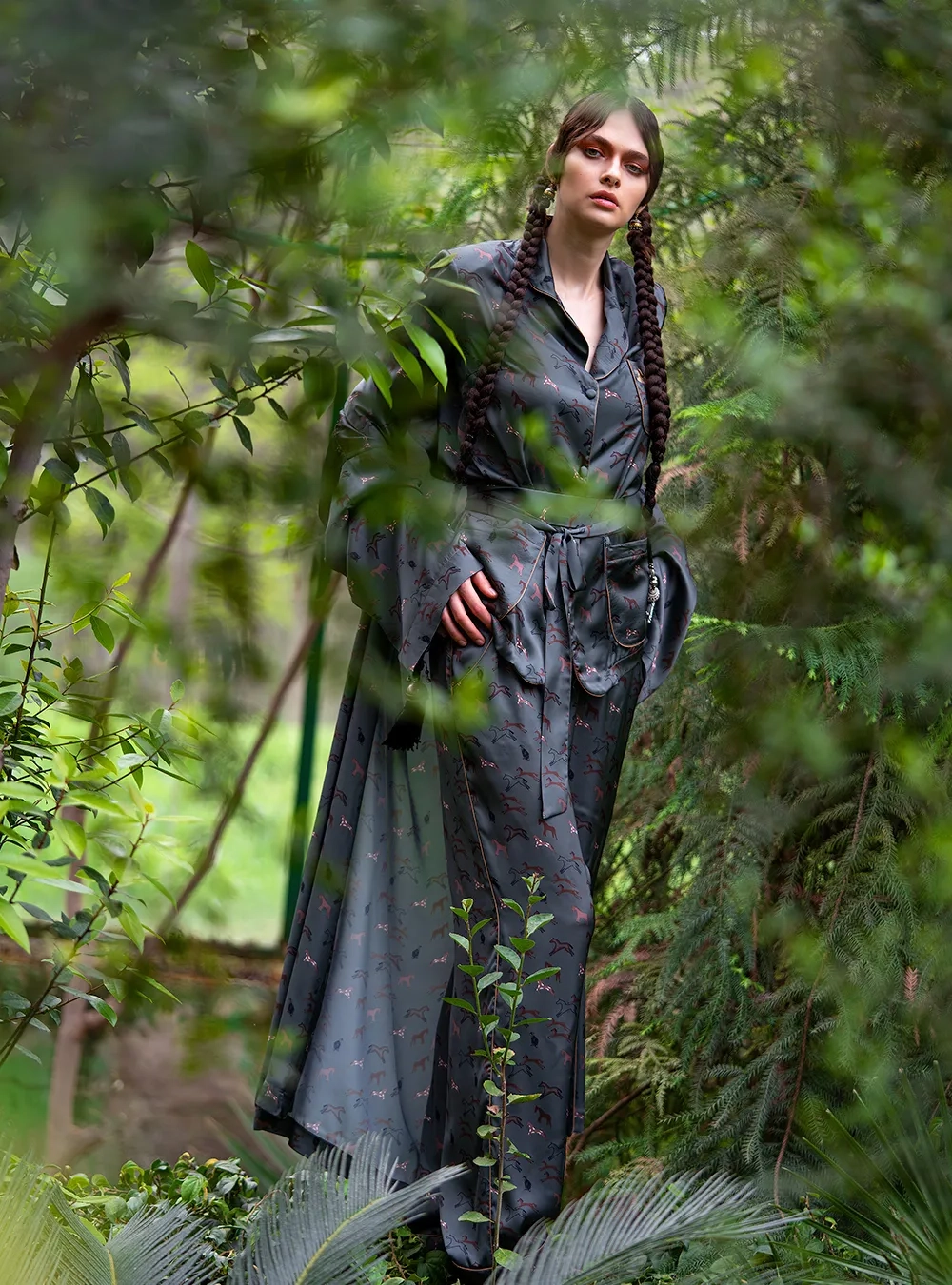 Пижама, дополненная накидкой в тон. Авторский орнамент Pahtagul вышит вручную пайетками и бисером. Стильное решение для вашего комфортного времяпровождения, а также стильного выхода в город. Также можно оставить заявку на изделие из другой ткани.