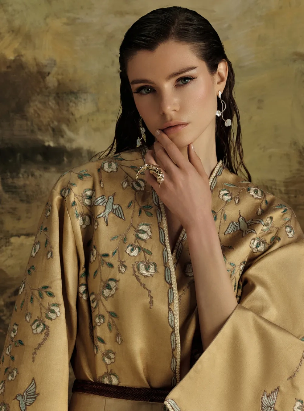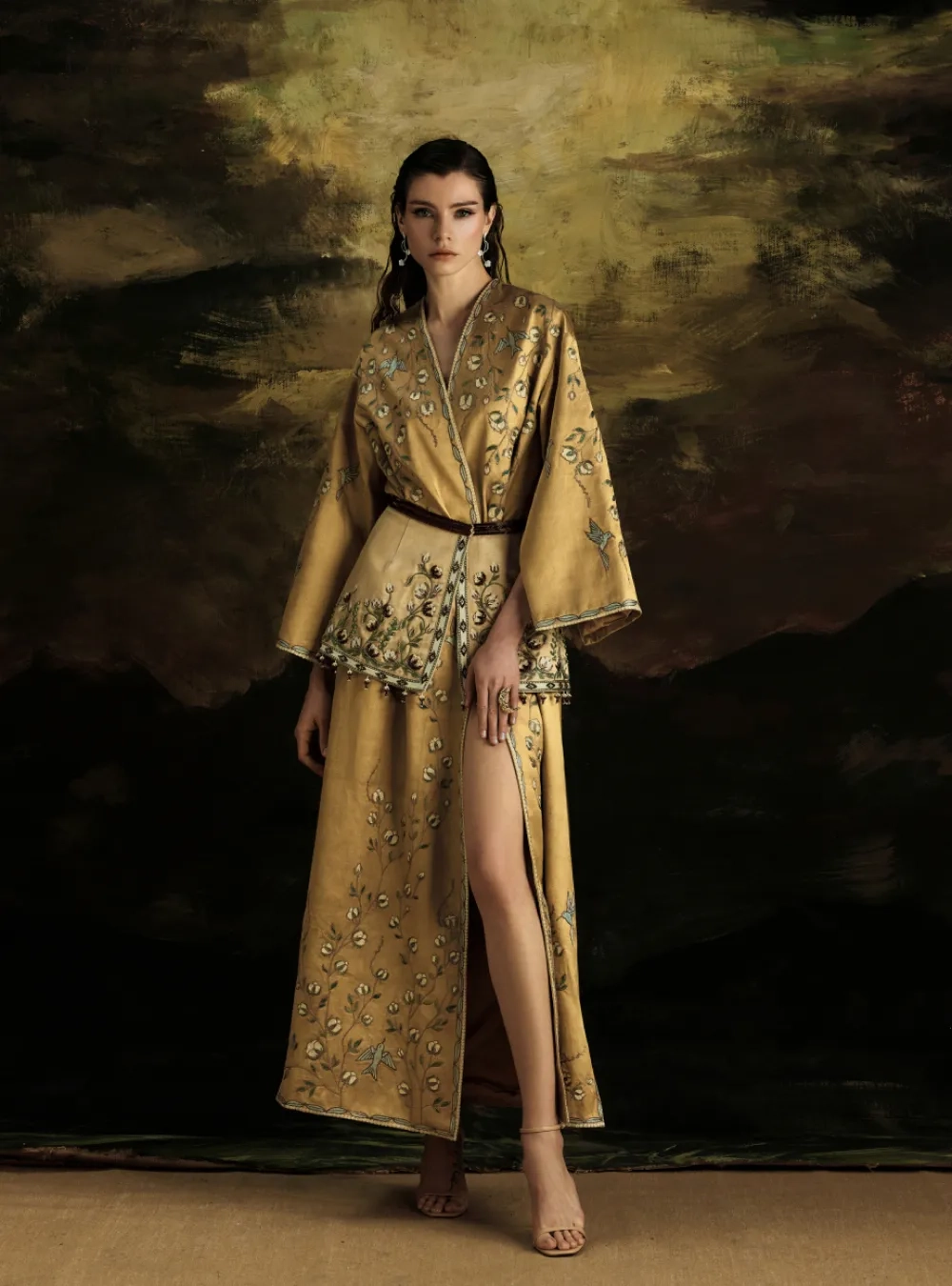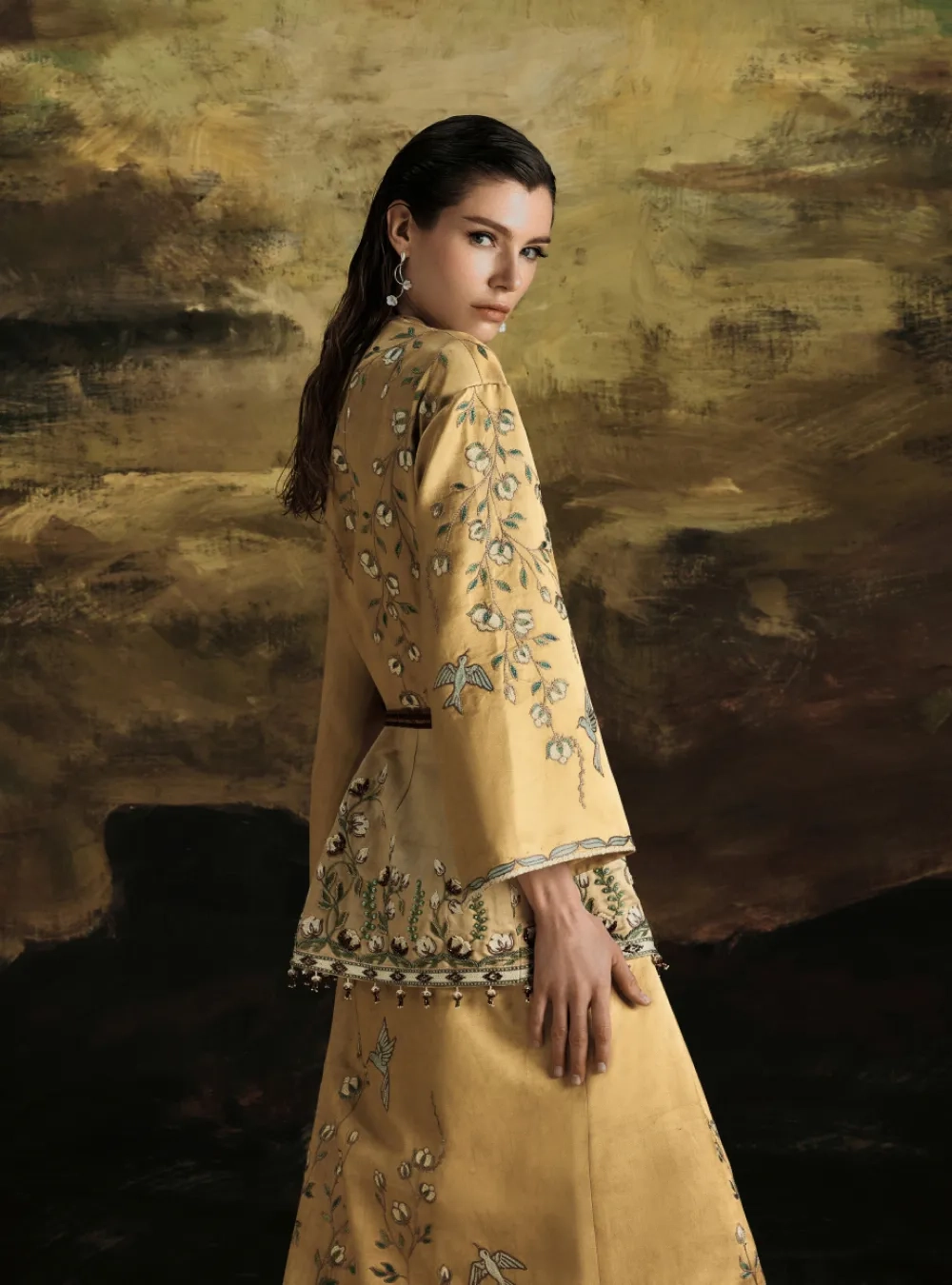 Золотистый чапан из шелка с вышивкой пахтагул и птицами — это сочетание роскоши и традиционного восточного искусства. Шелковая ткань золотистого оттенка переливается на свету, создавая ощущение утонченной элегантности. Этот цвет ассоциируется с богатством, светом и теплом, придавая чапану особый величественный вид.