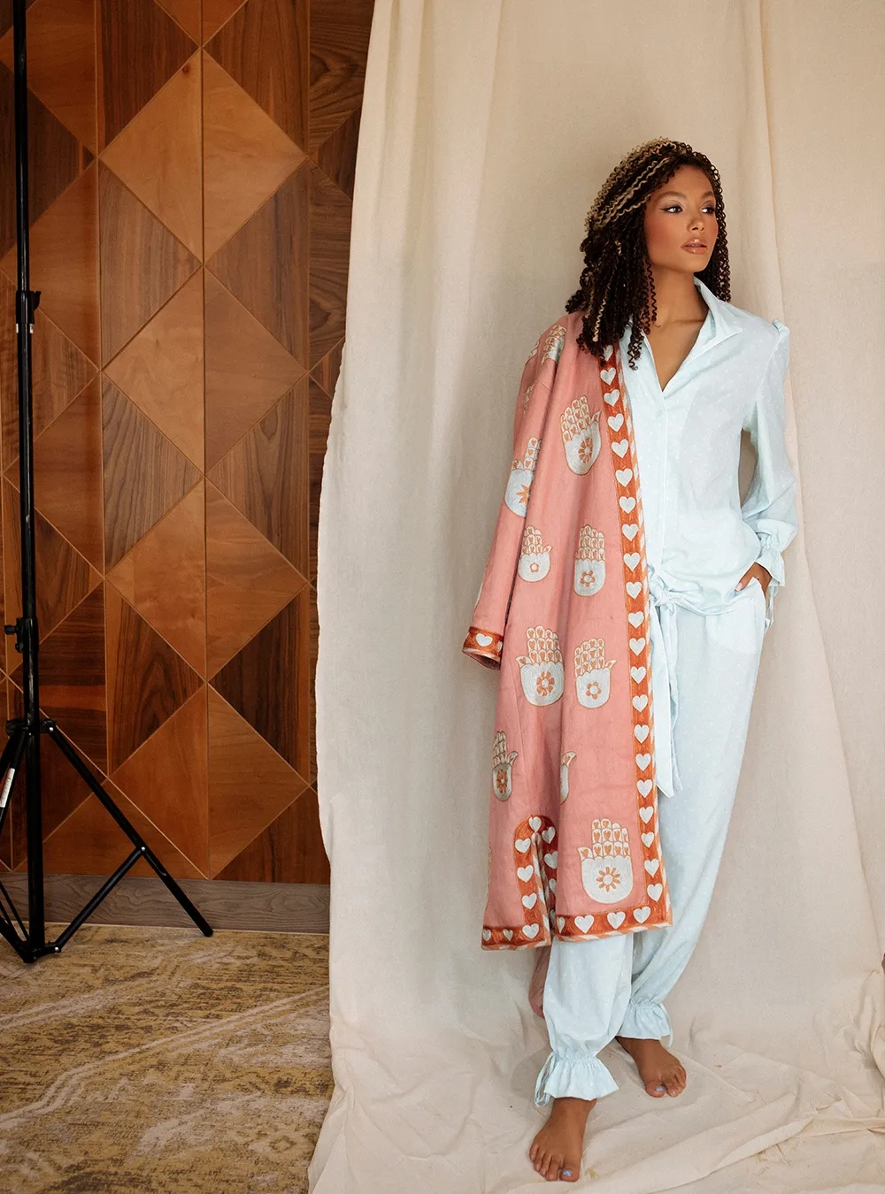 Чапан (узбекская национальная верхняя одежда) выполнен в традиционной технике с добавлением авторского видения дизайнера. Каждое изделие вышивается вручную бухарскими потомственными мастерами около двух месяцев. На рукавах предусмотрены молнии, чтобы стилизовать на разный лад.