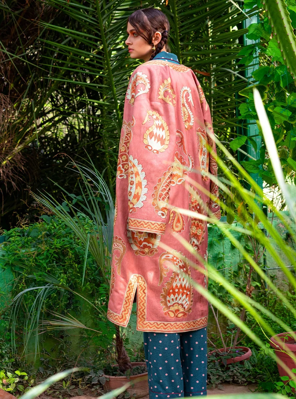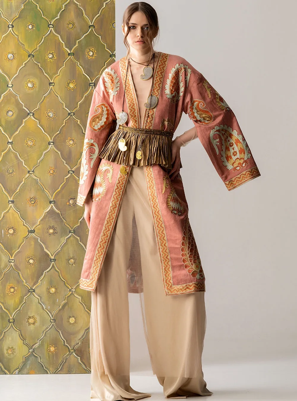 Чапан (узбекская национальная верхняя одежда) выполнен в традиционной технике с добавлением авторского видения дизайнера. Каждое изделие вышивается вручную бухарскими потомственными мастерами около двух месяцев. На рукавах предусмотрены молнии, чтобы стилизовать на разный лад.