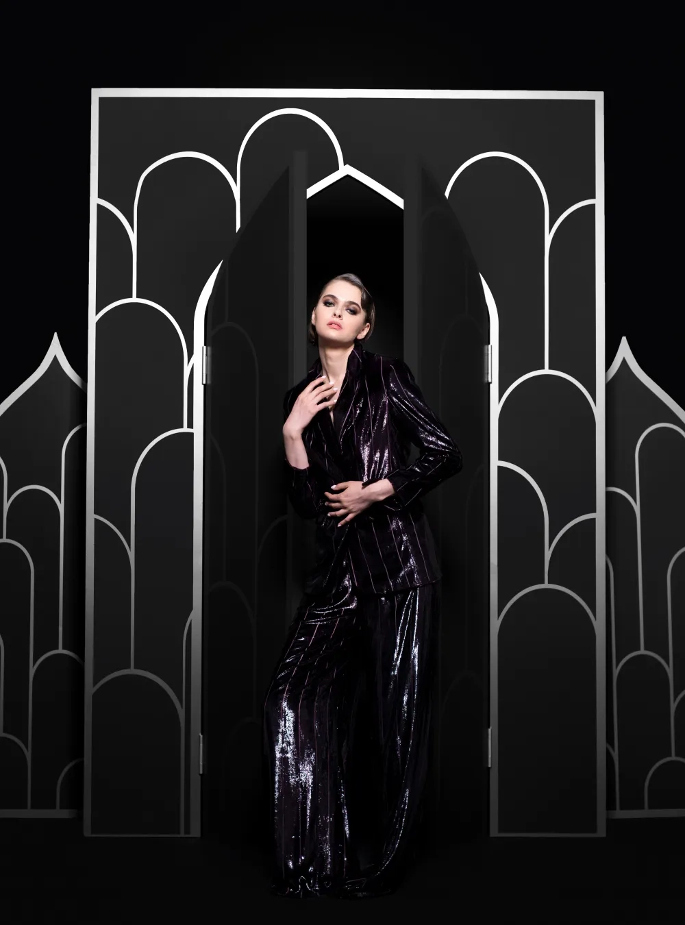 Вечерний брючный костюм из коллекции «Хамса». Изделие из люрекса станет эффектным выбором для ваших ярких событий.