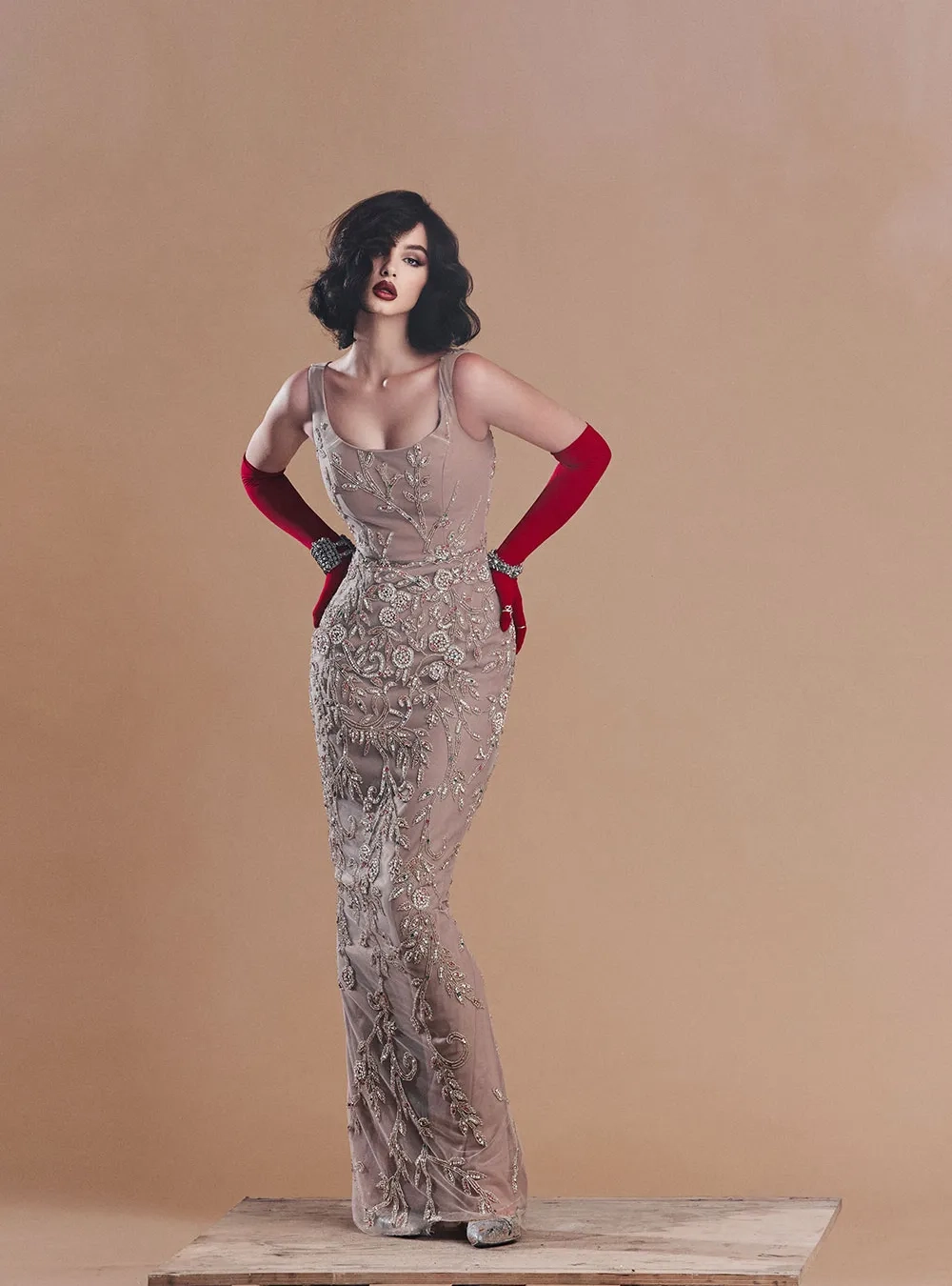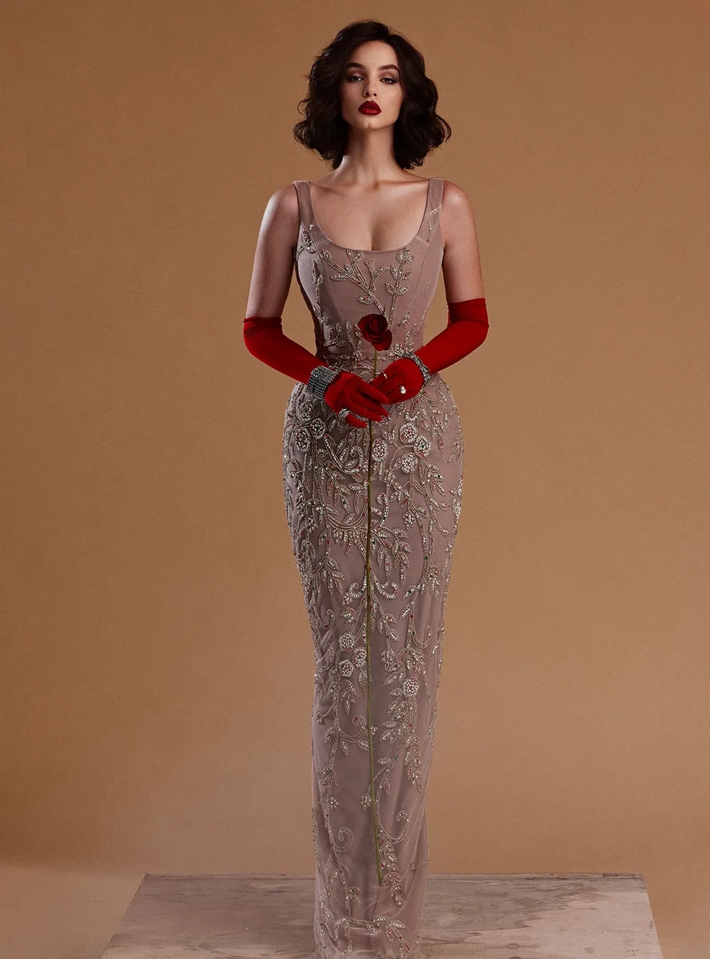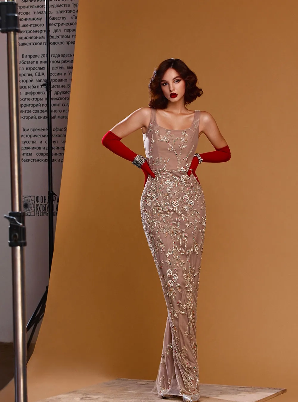 Роскошное вечернее платье из кутюрной коллекции «Весь мир — театр». Изделие декорировано мелкими стразами. Эффектный выбор для ваших ярких событий в жизни.