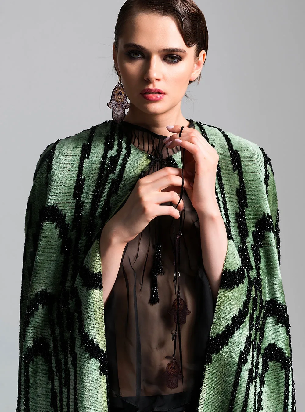Кейп классического кроя в авторском видении Дильдоры Касымовой. Выполнен из бахмаля и декорирован бисером.