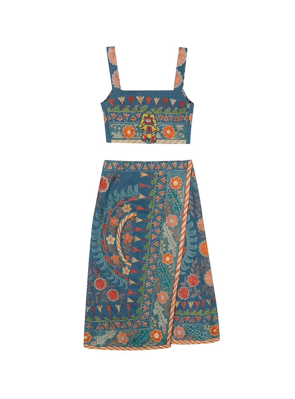 Топ и юбка с вышивкой из первой линии бренда. На создание этого изделия у потомственных мастеров Узбекистана уходит около двух месяцев. Станет эффектным выходом на мероприятие или на каждый день.