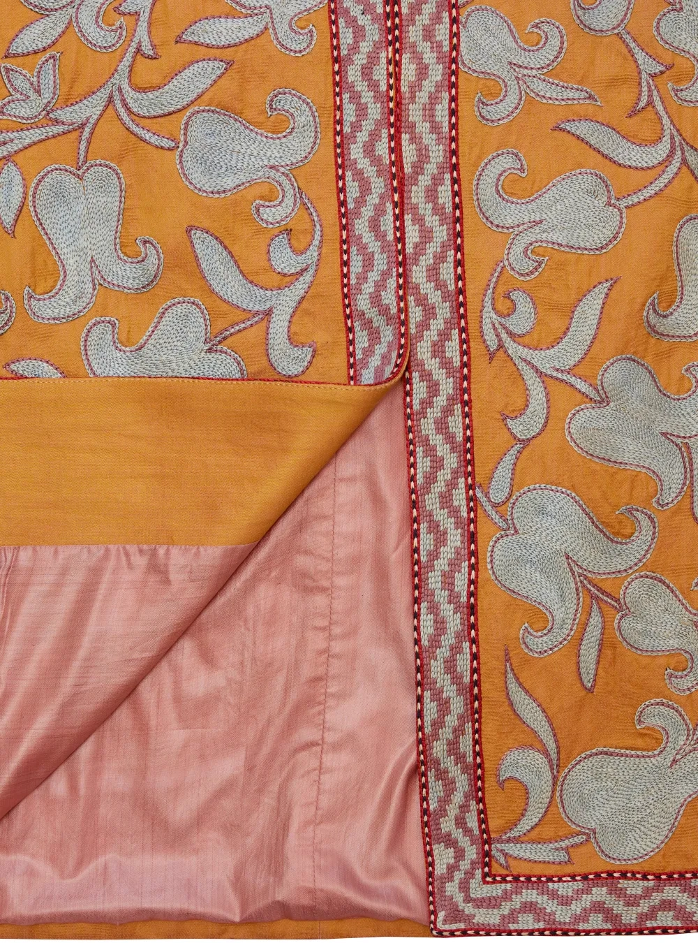 Чапан (узбекская национальная верхняя одежда) выполнен в традиционной технике с добавлением авторского видения дизайнера. Каждое изделие вышивается вручную бухарскими потомственными мастерами около двух месяцев. На рукавах предусмотрены молнии, чтобы стилизовать на разный лад.