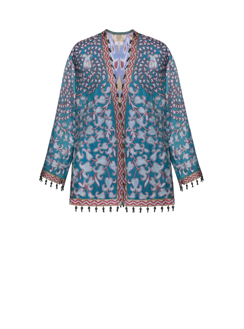 Чапан (узбекская национальная верхняя одежда) выполнен в традиционной технике с добавлением авторского видения дизайнера. Каждое изделие вышивается вручную бухарскими потомственными мастерами около двух месяцев. На рукавах предусмотрены молнии, чтобы стилизовать на разный лад.