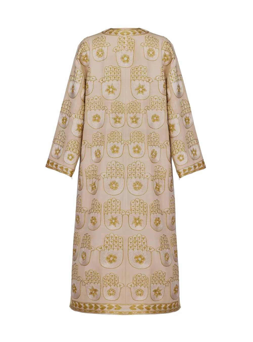 Чапан (узбекская национальная верхняя одежда) выполнен в традиционной технике с добавлением авторского видения дизайнера. Каждое изделие вышивается вручную бухарскими потомственными мастерами около двух месяцев. На рукавах предусмотрены молнии, чтобы стилизовать на разный лад.