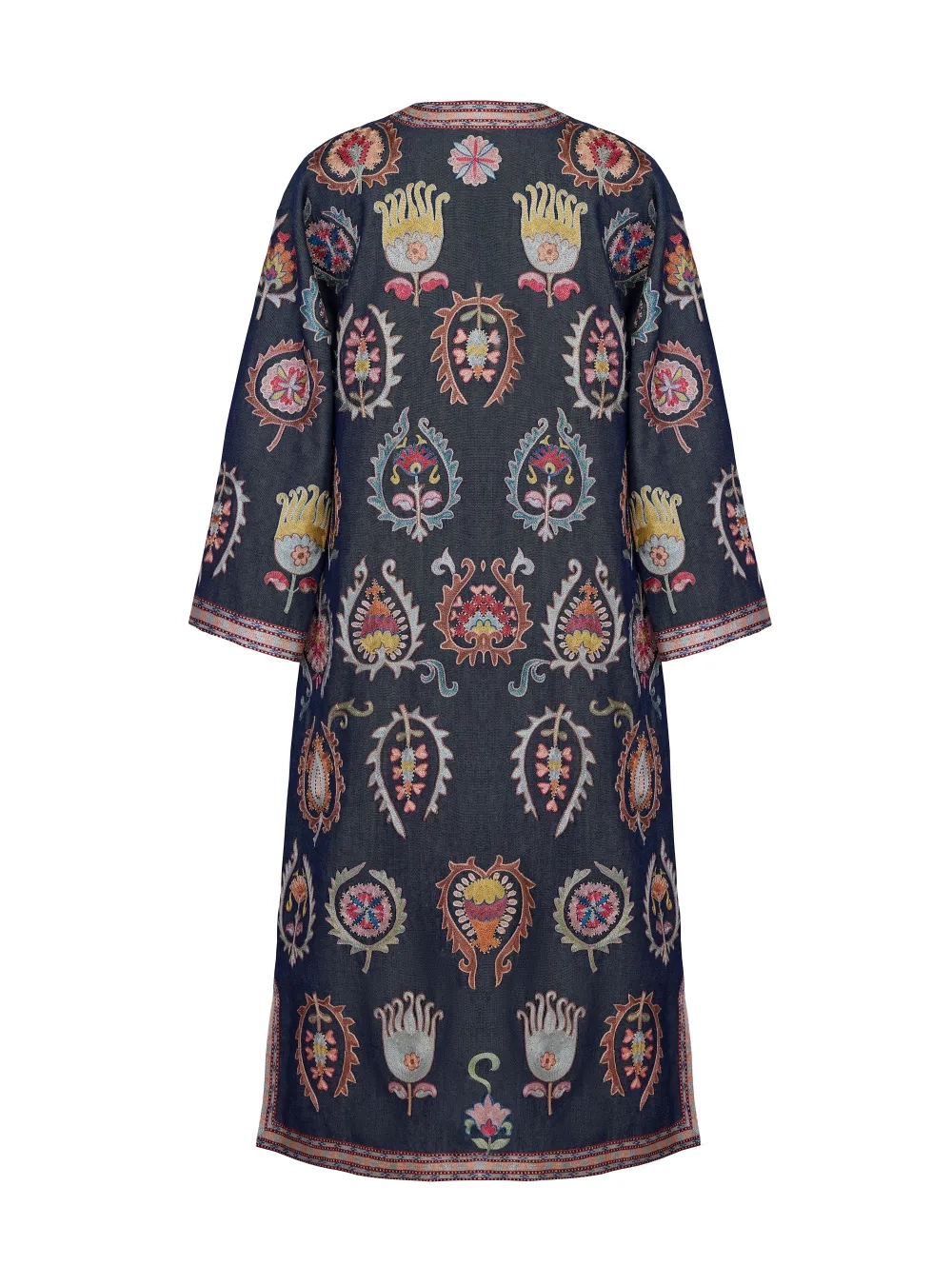 Чапан (узбекская национальная верхняя одежда) выполнен в традиционной технике с добавлением авторского видения дизайнера. Каждое изделие вышивается вручную бухарскими потомственными мастерами около двух месяцев. На рукавах предусмотрены молнии, чтобы стилизовать на разный лад.