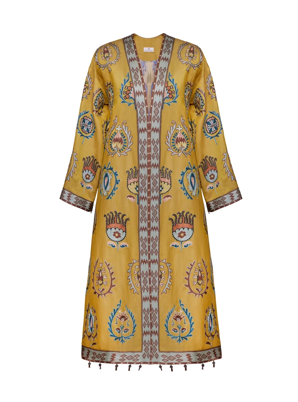 Чапан (узбекская национальная верхняя одежда) выполнен в традиционной технике с добавлением авторского видения дизайнера. Каждое изделие вышивается вручную бухарскими потомственными мастерами около двух месяцев. На рукавах предусмотрены молнии, чтобы стилизовать на разный лад.