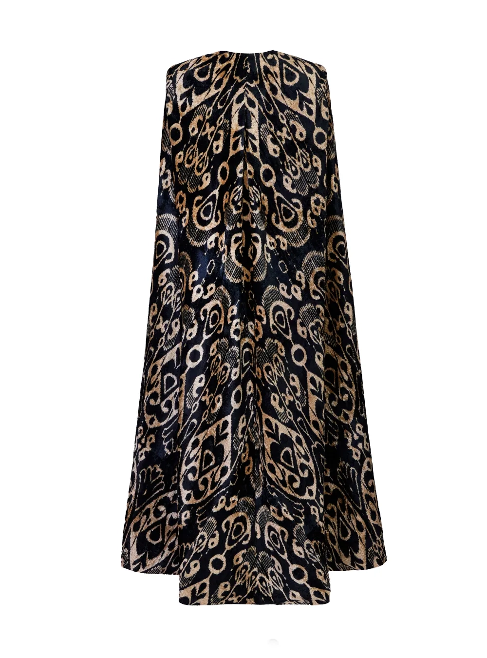 Кейп классического кроя в авторском видении Дильдоры Касымовой. Выполнен из натурального бахмаля и станет эффектным выбором для ваших ярких событий.