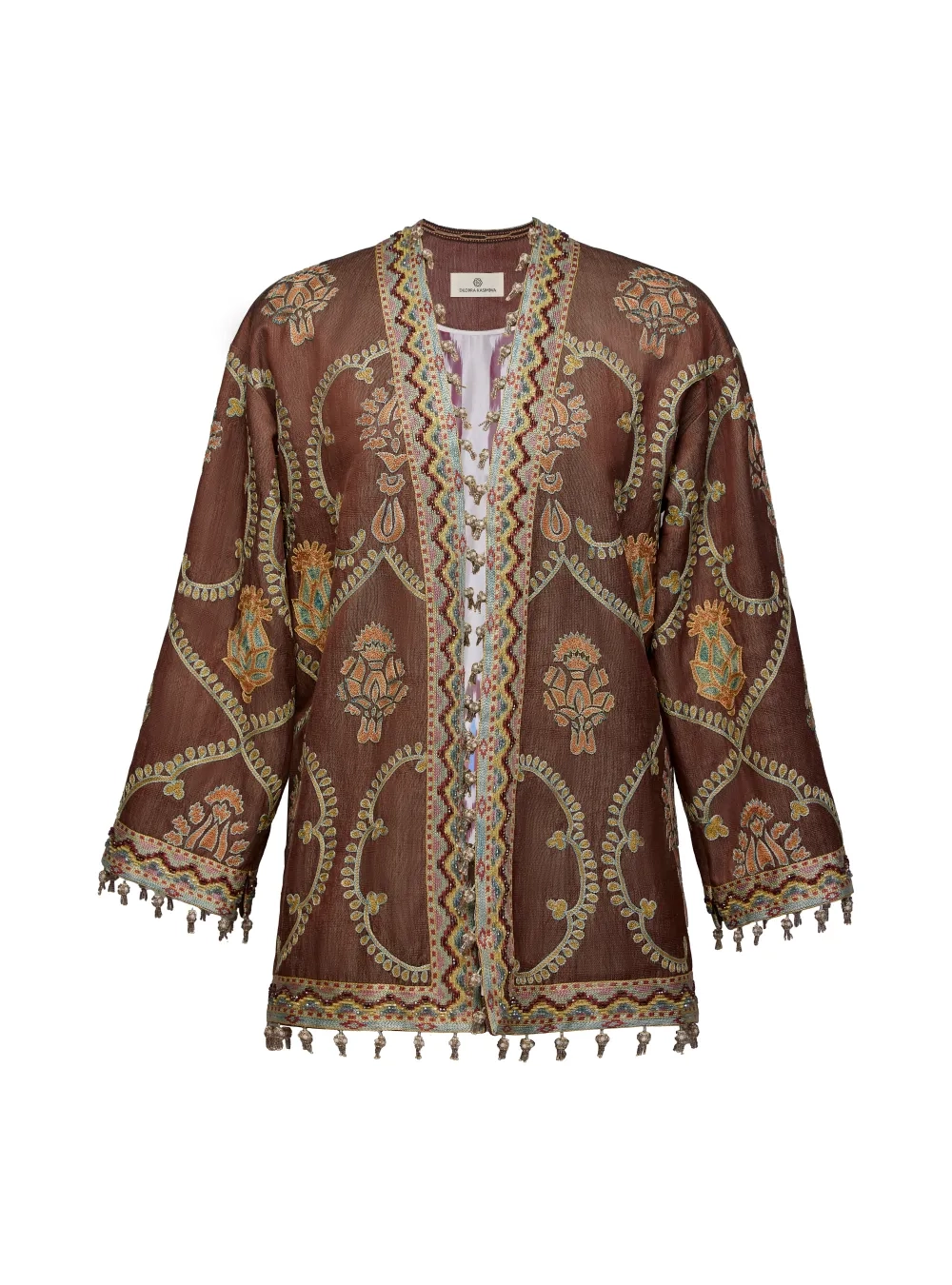 Чапан (узбекская национальная верхняя одежда) выполнен в традиционной технике с добавлением авторского видения дизайнера. Каждое изделие вышивается вручную бухарскими потомственными мастерами около двух месяцев. На рукавах предусмотрены молнии, чтобы стилизовать на разный лад.
