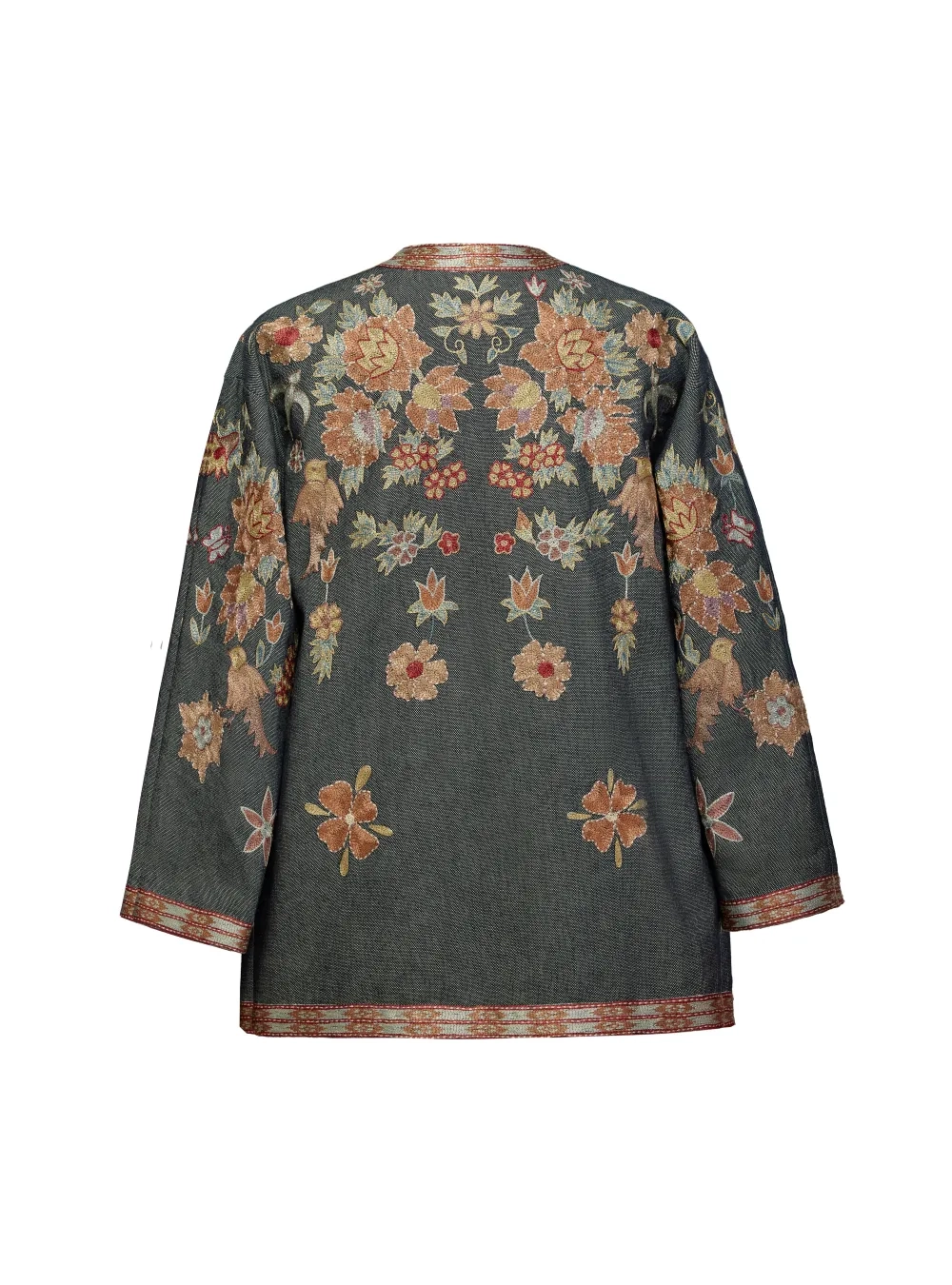 Чапан (узбекская национальная верхняя одежда) выполнен в традиционной технике с добавлением авторского видения дизайнера. Каждое изделие вышивается вручную бухарскими потомственными мастерами около двух месяцев. На рукавах предусмотрены молнии, чтобы стилизовать на разный лад.